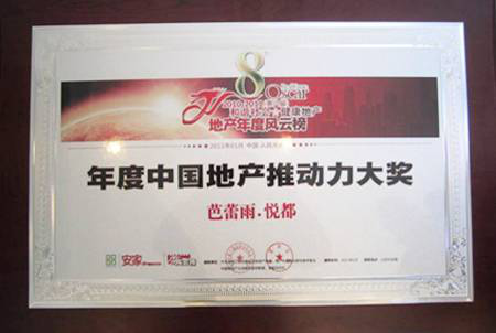 2011年1月9日,由全國(guó)工商聯(lián)房地產(chǎn)商會(huì)與《安家》雜志社聯(lián)合主辦的地產(chǎn)界盛典——第八屆“地產(chǎn)年度風(fēng)云榜”評(píng)選在北京人民大會(huì)堂舉行隆重的頒獎(jiǎng)儀式。奧特萊斯投資管理有限公司獲得“區(qū)域經(jīng)濟(jì)推動(dòng)力功勛企業(yè)”大獎(jiǎng),芭蕾雨•悅都項(xiàng)目憑借產(chǎn)品創(chuàng)新優(yōu)勢(shì)以及開(kāi)盤(pán)當(dāng)日售罄的突出業(yè)績(jī),榮獲“年度中國(guó)地產(chǎn)推動(dòng)力大獎(jiǎng)”。