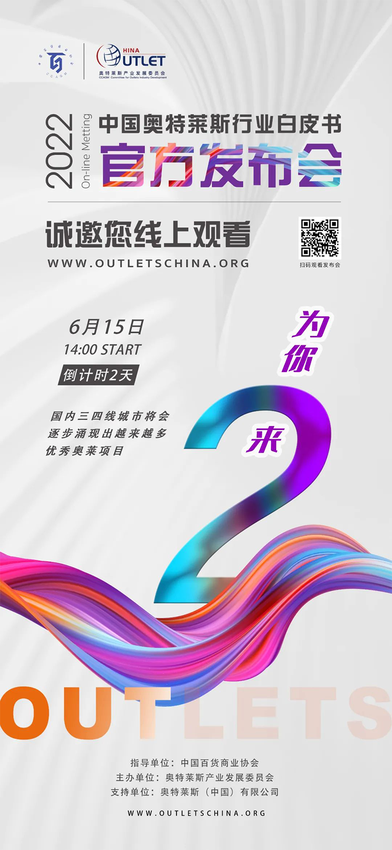 2022年6月15日14:00,《2022年中國(guó)奧特萊斯行業(yè)白皮書》線上發(fā)布會(huì)即將正式開(kāi)始,本次發(fā)布會(huì),將對(duì)國(guó)內(nèi)零售市場(chǎng)及奧萊產(chǎn)業(yè)引入中國(guó)20年發(fā)展的經(jīng)驗(yàn)及機(jī)遇做出全新解讀。
