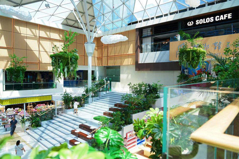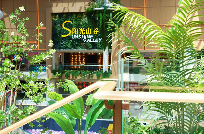 通過填補(bǔ)主中庭和動線調(diào)整等手段,設(shè)計(jì)團(tuán)隊(duì)共打造了“云光”“藝境”“SHOW TIME” 、“陽光山谷”四大主題空間,分別對應(yīng)“美妝-云光之下的時(shí)尚美學(xué)”“生活-探尋生活中的靈感意境”“潮&趣-年輕力探索中心”“藝術(shù)-綠色有機(jī)陽光山谷邂逅藝術(shù)與美食”主力場,增強(qiáng)了品類與空間氛圍的聯(lián)結(jié)性,使一二三期動線順暢連通,有效拉動客流向上走。其中七樓的“陽光山谷”跨層主題空間,將自然生態(tài)的綠植元素和本地的河川山谷地貌滲透其中,把自然河谷的流線設(shè)計(jì)與室內(nèi)整體動線的層次結(jié)合,增加了商場的游逛體驗(yàn)。