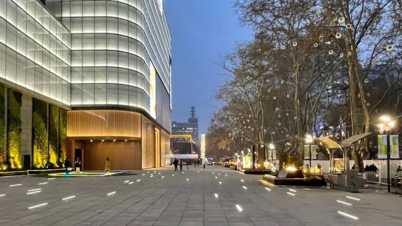室外兩面的廣場區(qū)域分別被設(shè)計(jì)為憩(水秀廣場)、聯(lián)(商業(yè)步行通廊)、迎(慶典廣場)、趣(彈性劇場)、達(dá)(地面停車場/生活超市)五大部分,每個部分都將標(biāo)識、景觀鋪裝、綠植、親水景觀、多媒體藝術(shù)裝置等與建筑整體設(shè)計(jì)風(fēng)格進(jìn)行了統(tǒng)一,融合了現(xiàn)代、藝術(shù)、科技與綠色的室外區(qū)域營造出了宜人舒適的氛圍。