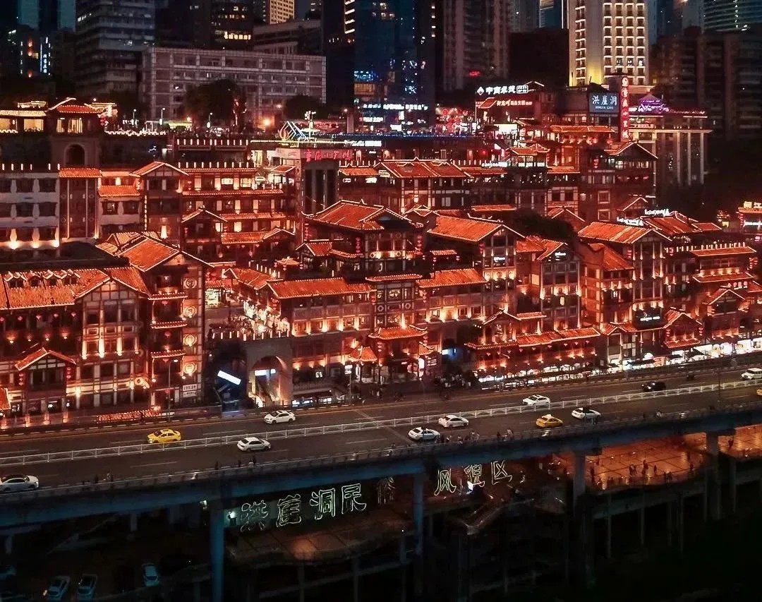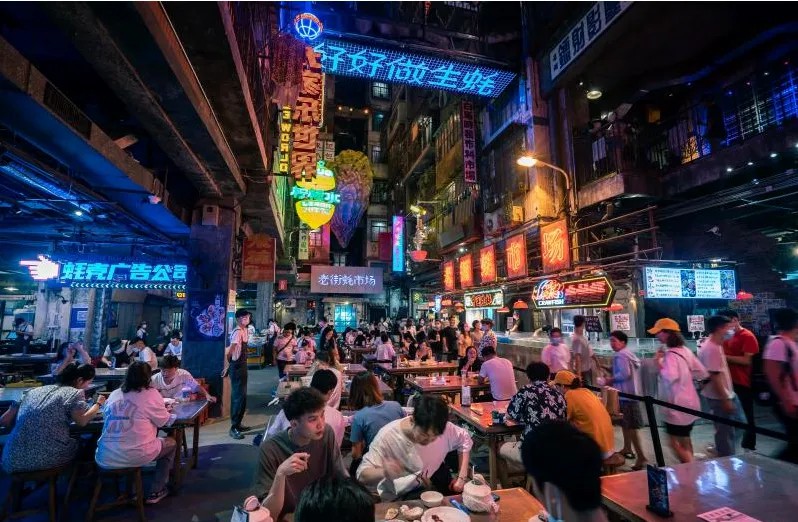 憑借巴渝傳統(tǒng)特色建筑的吊腳樓,光怪陸離的夜景,以及媲美《千與千尋》的二次元的視覺呈現(xiàn),在開街10年后進入“黃金時代”,借助新媒體和IP話題發(fā)酵不斷攀升,發(fā)展成為如今的頂流的IP網紅地標。