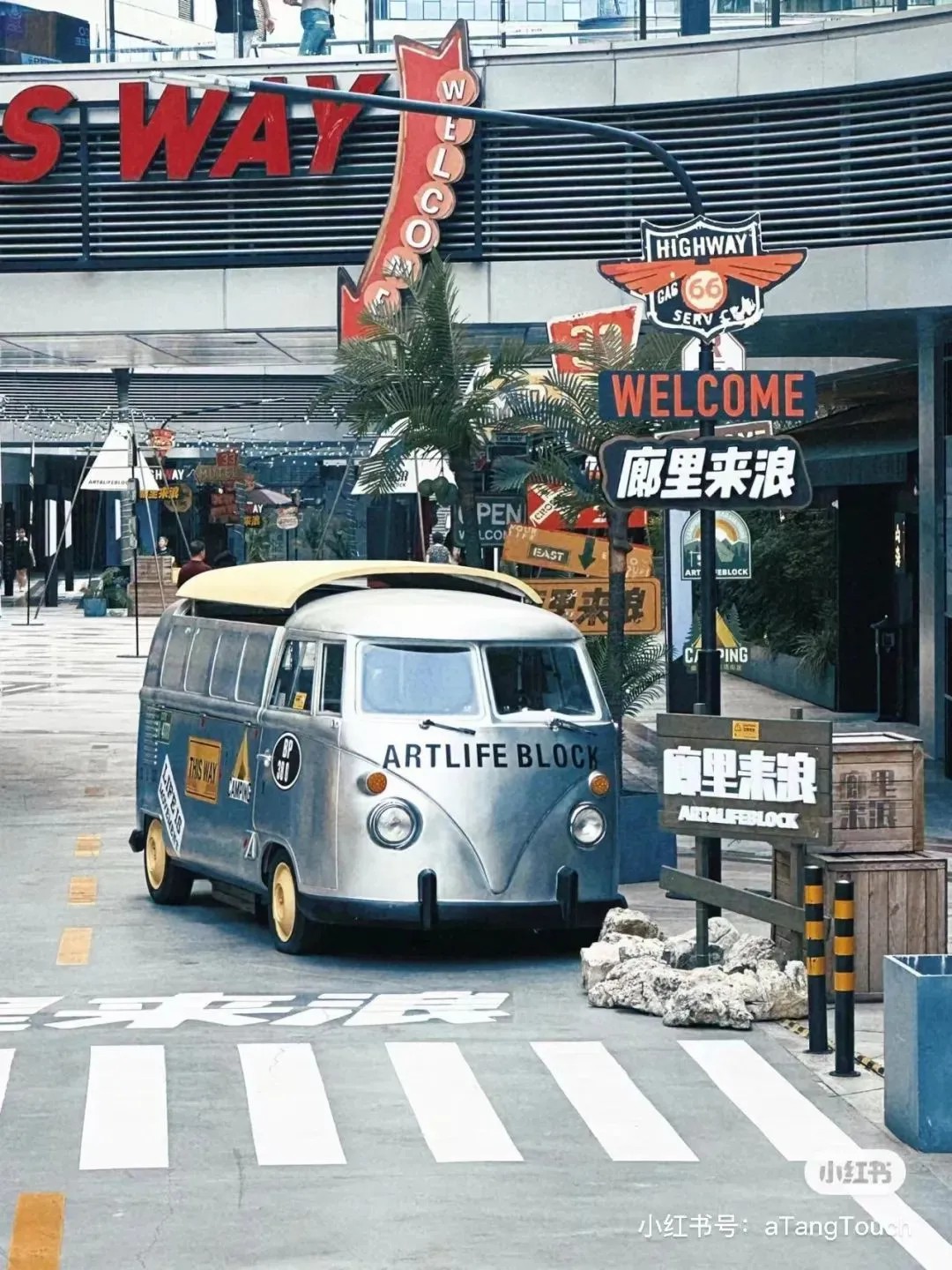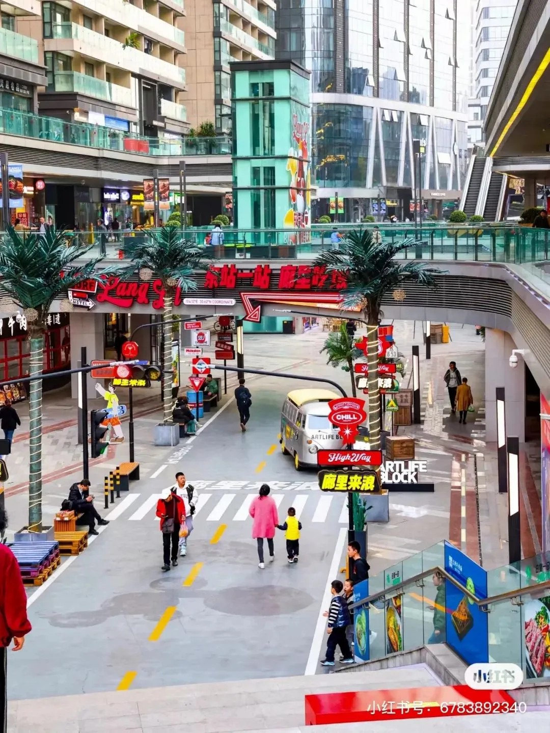 街區(qū)核心的下沉式廣場,匠心獨運,以美式公路風(fēng)情為藍本,巧妙融合異域風(fēng)韻與休閑度假氣息,不僅設(shè)計獨樹一幟,更成攝影打卡新寵,讓人仿佛穿越時空,瞬間切換場景,領(lǐng)略多元文化的魅力。此舉不僅巧妙解決了傳統(tǒng)商業(yè)下沉空間引流之困,更為其注入了勃勃生機與無限可能。