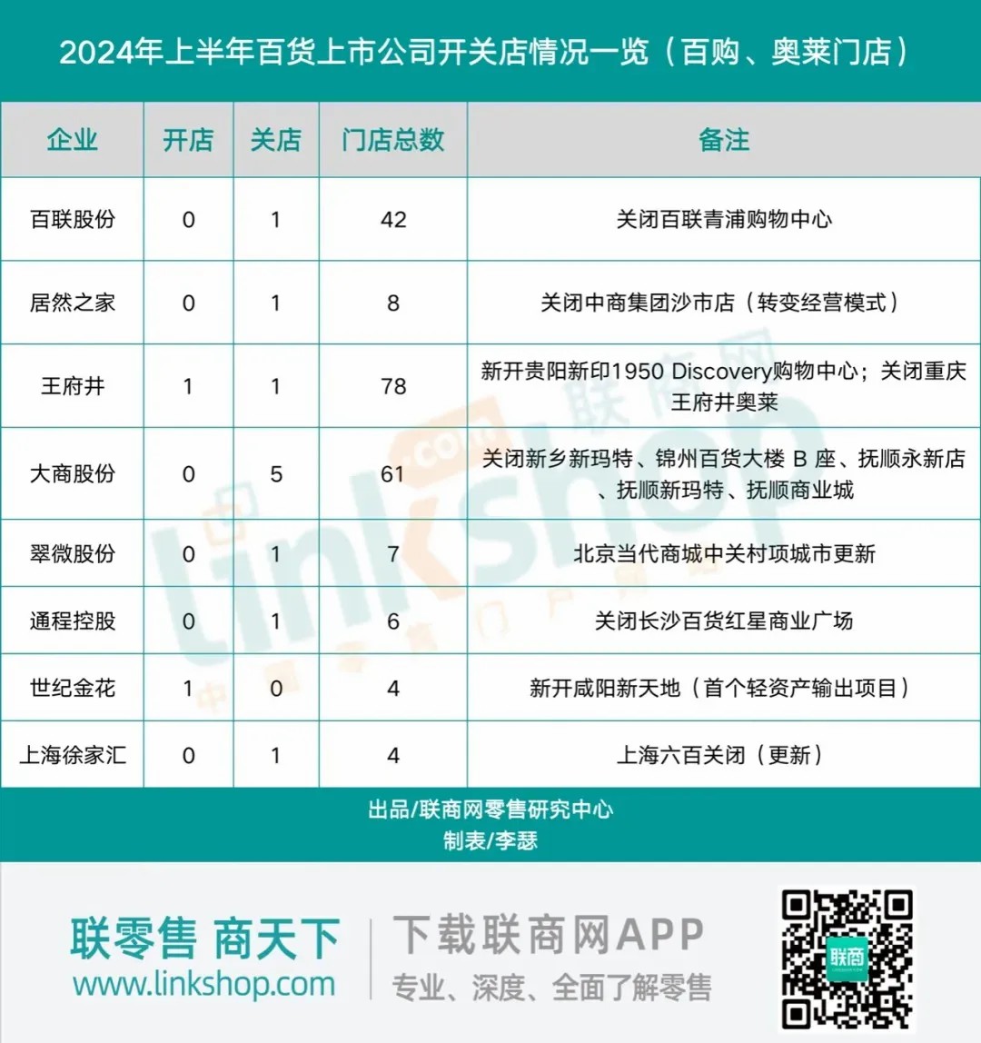在門店的開設與關閉動態(tài)上,2024年上半年呈現出一個顯著的趨勢:關店數量遠超開店數量。具體而言,44家百貨上市公司在此期間僅新增了2家門店(此數據僅限于百貨商店、購物中心及奧特萊斯門店),而關閉的門店數量則達到了11家。與之形成對比的是,去年同期這些公司開關店的數量均為5家。這一變化表明,與去年相比,百貨上市公司在開設新店方面變得更加謹慎,而關閉門店的速度卻在加快。