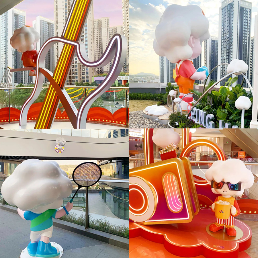 有趣的是,項(xiàng)目還推出了原創(chuàng)IP「多多」,作為項(xiàng)目與消費(fèi)者對(duì)話的符號(hào),以云朵為靈感,化身不同的角色,串聯(lián)起星空廣場(chǎng)、藝術(shù)連廊、屋頂公園等戶外空間場(chǎng)景,使獨(dú)特的記憶符號(hào)變得豐滿,憑無界創(chuàng)意加速突破商業(yè)空間界限,賦能多元互動(dòng)體驗(yàn)場(chǎng)景。
