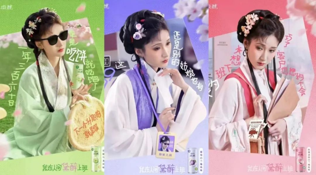 比如在五一調(diào)休這個(gè)社會(huì)熱點(diǎn)話題中,RIO雞尾酒請(qǐng)出了大IP林黛玉,推出一組“我在人間黛醉上班”的海報(bào),每一句都非常“有那味兒”。這組海報(bào)以林黛玉的形象為核心,將她的古典韻味與現(xiàn)代職場(chǎng)生活巧妙融合,每一幅都充滿了獨(dú)特的韻味與深意。