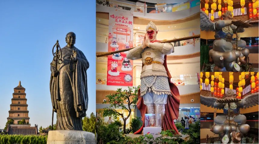 以西安大悅城為例,他深挖大唐、長(zhǎng)安歷史文化底蘊(yùn),與在地城市地標(biāo)形成呼應(yīng),中庭悟空與大雁塔玄奘雕像隔街對(duì)望,并打造契合潮流時(shí)尚客群訴求的“勿空”美食街區(qū)與“不戒食巷”,街區(qū)內(nèi)的墻體上還有師徒四人取經(jīng)歸來(lái)的立體壁畫(huà),讓原本只以美陳形式存在的孫悟空、豬八戒變成文化傳播的紐帶。