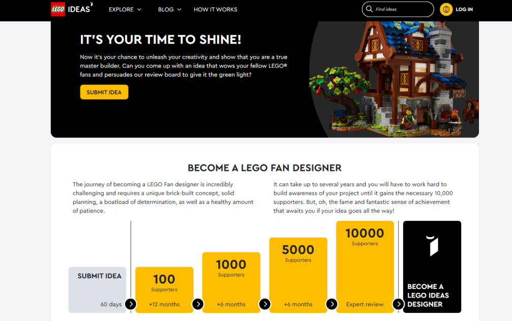 樂高通過“樂高創(chuàng)意”(LEGO IDEAS)這一在線創(chuàng)意平臺(tái),為全球樂高愛好者提供了展示自己作品的機(jī)會(huì)。在線上創(chuàng)意社區(qū)這一開放互動(dòng)平臺(tái)中,用戶可以提交各種創(chuàng)意作品,獲得高投票的優(yōu)秀作品可成為樂高的正式產(chǎn)品。此時(shí),品牌與用戶之間不再是傳統(tǒng)的買賣關(guān)系,而是合作共創(chuàng)的伙伴。